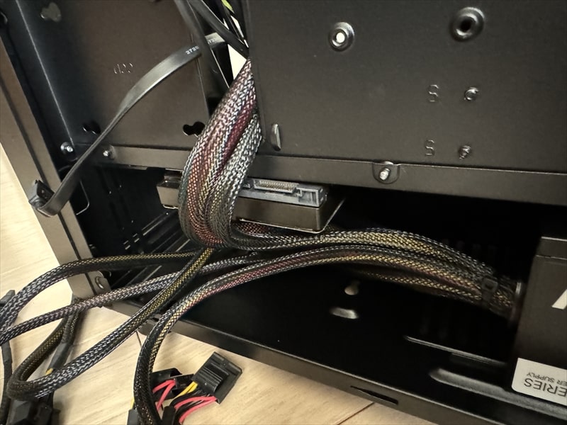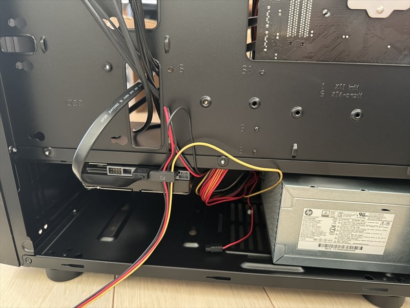 HDDは当初上段に取り付けましたが、SATAケーブルはマザーボードに付いていたものを使うとカバーを付けた際のクリアランスが少ないので、L字型ケーブルはないことからHDDは下側に付け直ししました。