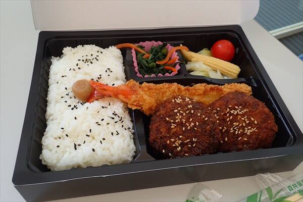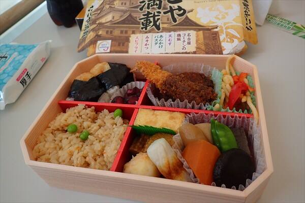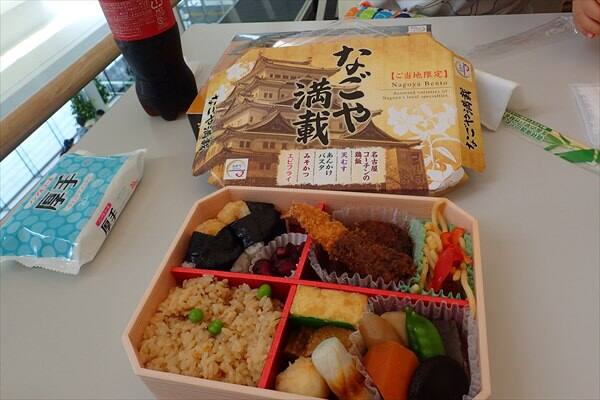 内容は名古屋コーチンの鶏飯、海老天むす、みそかつ、エビフライ、あんかけパスタに野菜の煮物、ちくわ、玉子焼きとなっています。