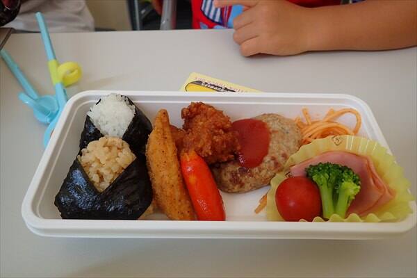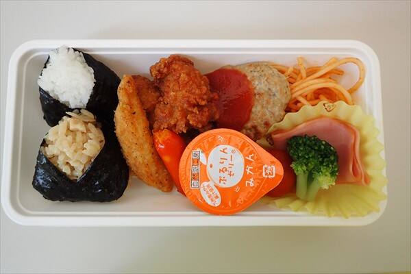 お弁当の内容はおにぎりや、ハンバーグ、ポテトフライ、鶏唐揚、ゼリーとなっています。