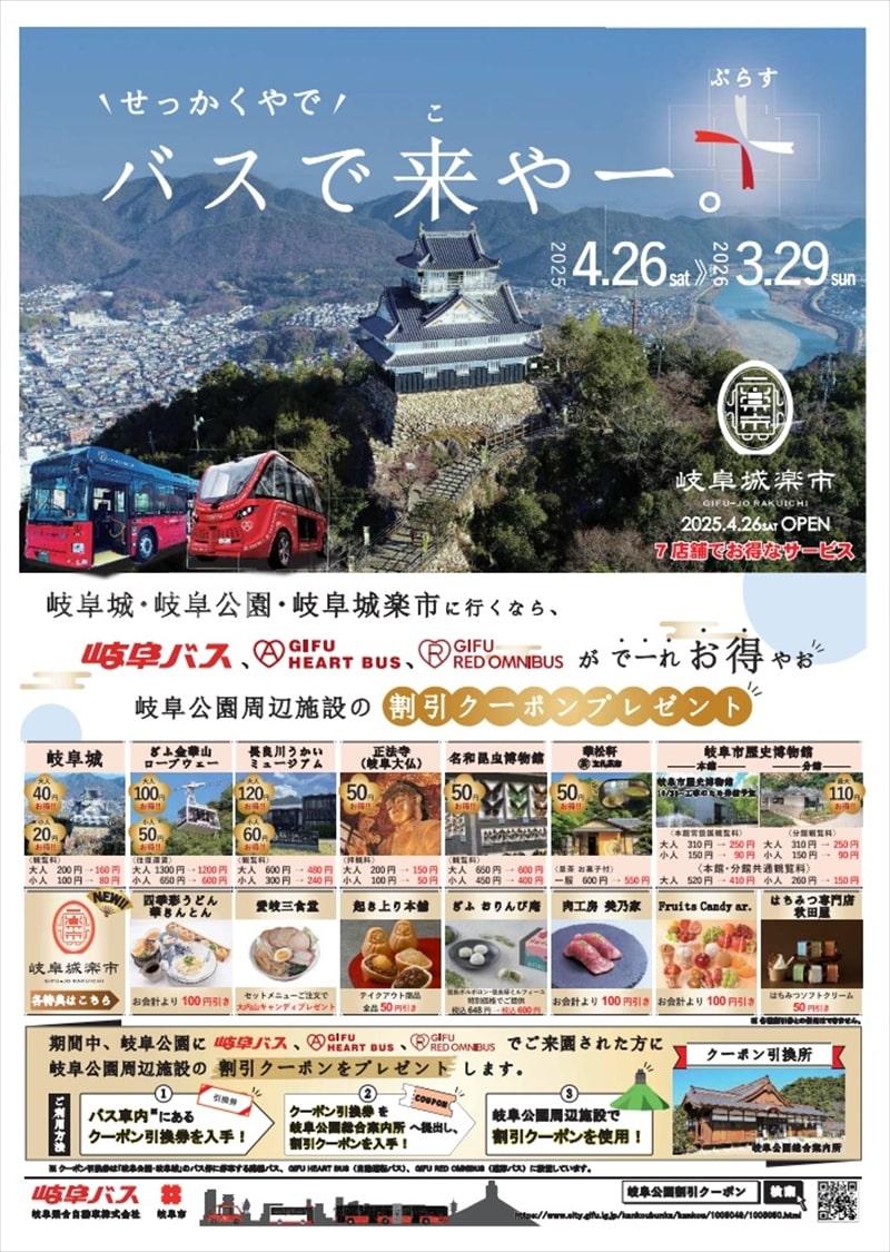 私たちは名鉄岐阜駅から岐阜バスで金華山まで行ったのですが、岐阜バスの車内では岐阜公園周辺施設割引クーポン引換券が置かれていて、バスに乗車していたぎふ登城きっぷの利用者以外の方はそれを持って行く方が多かったのです。