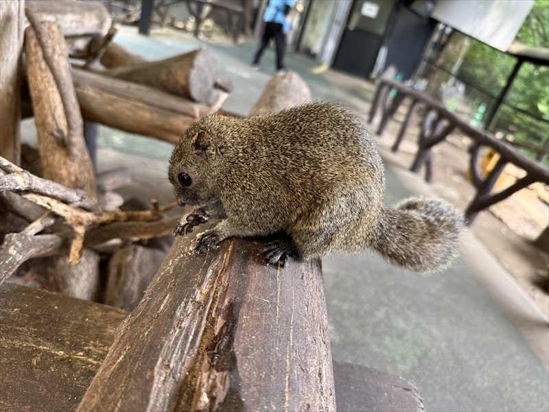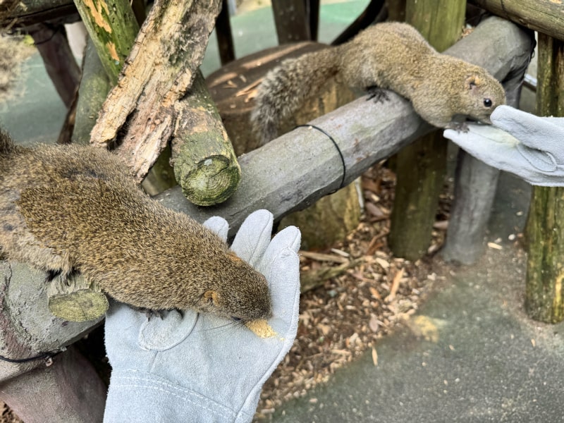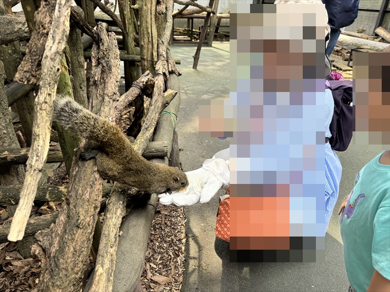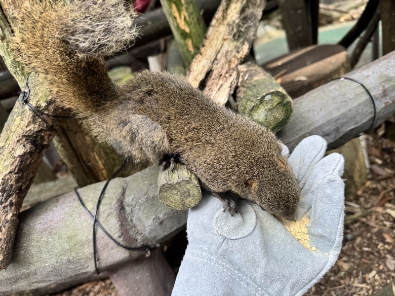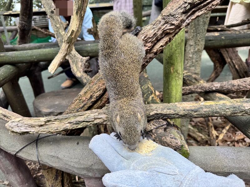 私たちがリス村に入る前に小学生の遠足の団体がいましたので、リスはエサをもらいすぎて寄ってきてくれないかなと思ったのですが、手袋の上に係の方からエサを乗せてもらいますとすぐにリスが寄ってきました。