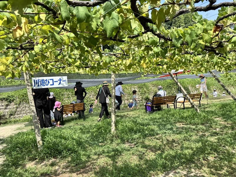 ぶどうを食べていますと午前10時40分頃に係のおじさんが子供の所に来て、今から川でバケツに入った小さな鯉の魚を放流するから遊びに来てねと言っていました。