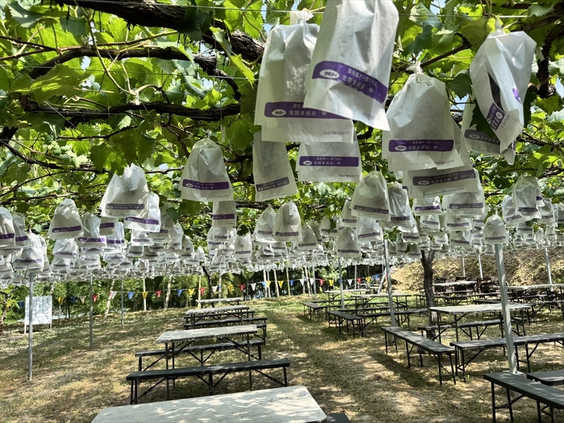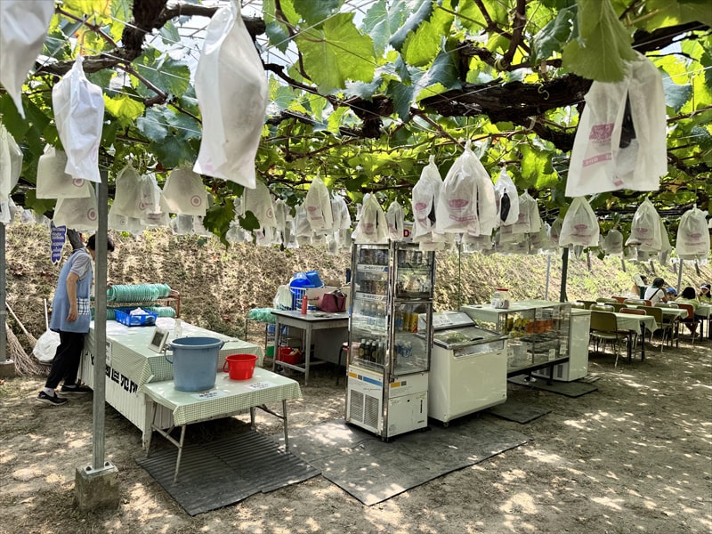 受付のある巨峰のぶどう棚には受付がある側の棚には種無しの巨峰があり、反対側の棚には種ありの巨峰がなっていました。