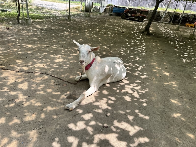 暑い日でしたし、この棚の場所は風がまったく通らない場所となっていましたので、犬もヤギも暑さで地面に座って体を冷やしていました。