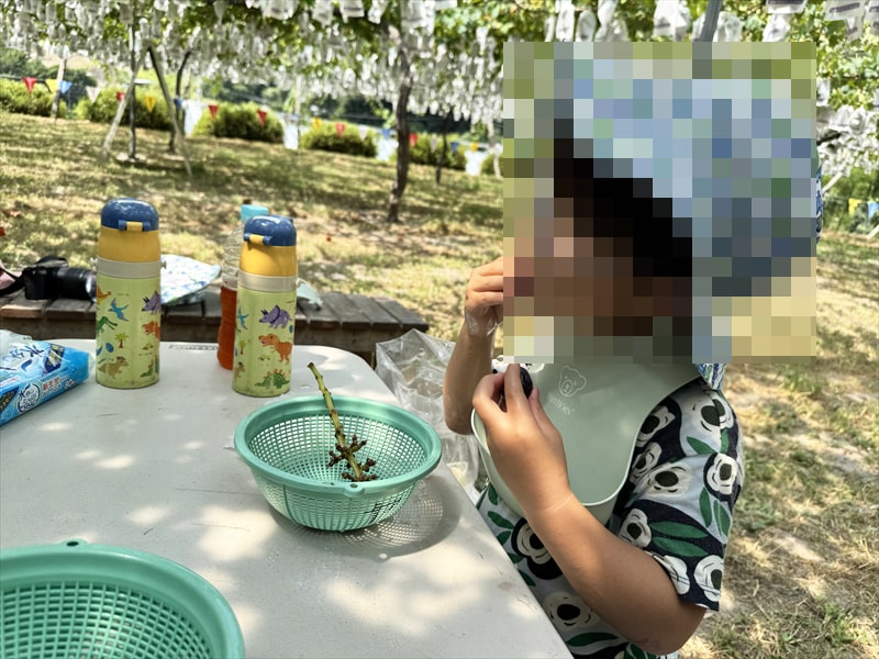 わが家の子供は来た時の服のまま川で遊んで濡れてしまいましたので、川遊び後に再びぶどうを塗れた服のままで食べていましたら寒いと言い出しました。