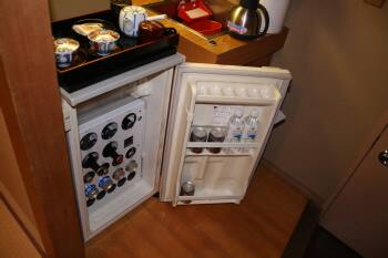 部屋内には貴重品を入れる金庫もあり、ビールやジュースが入っている冷蔵庫、テレビがあります。