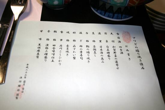 今回の宿泊はリーズナブルな設定の季節の会席にアワビの踊り焼きが付いたプランでした。