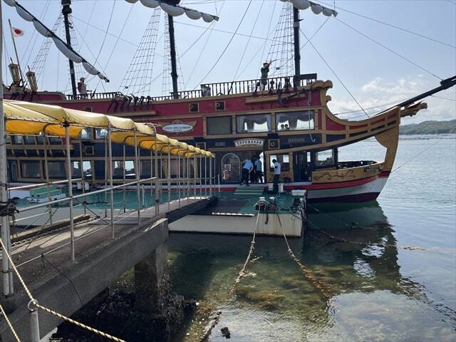 無料で停めることができる賢島駅よこにある市営の駐車場に車を停めて船長のユニークなアナウンスが評判というあご湾島めぐりクルーズに乗ろうと乗船場に行きましたが、乗船場にいたスタッフに「今からだと10分後に賢島エスパーニャクルーズの船が出るよ」と言われましたので急遽チケットセンターでチケットを購入して出発直前に乗船しました。
