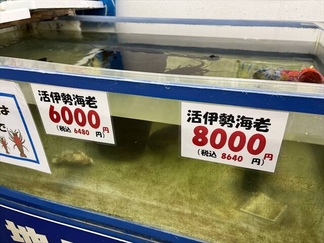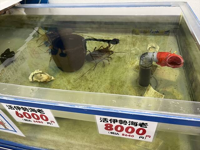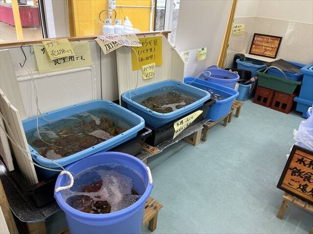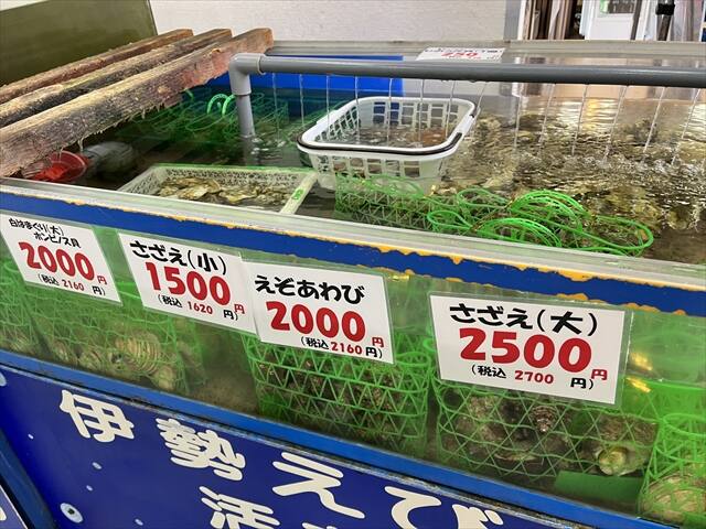 入ったすぐにある水槽には白ハマグリやエゾアワビ、サザエが販売されていました。