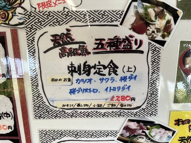 本日のお刺身はカツオ、サワラ、桜ダイ、桜ブリ大トロ、イトヨリダイとなっていました。