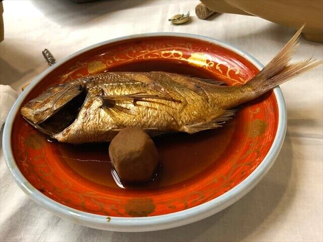 味噌汁には昨日の船盛にあった伊勢海老の頭が入っているかと思ったのですが、実際は生き作りの鯛の頭部分が入っていました。
