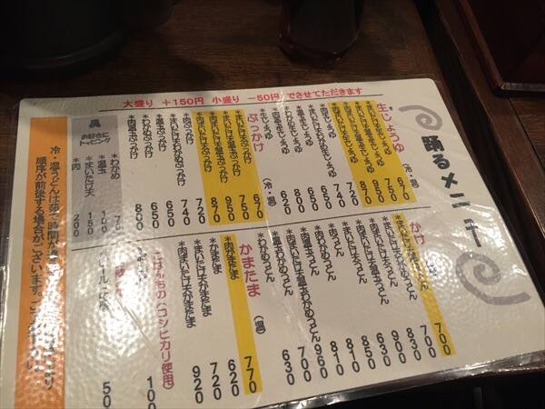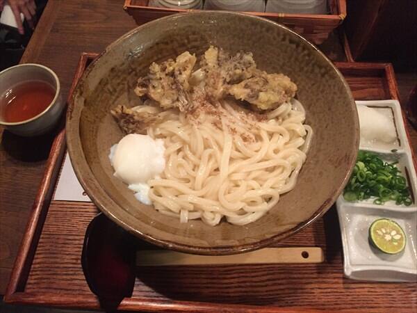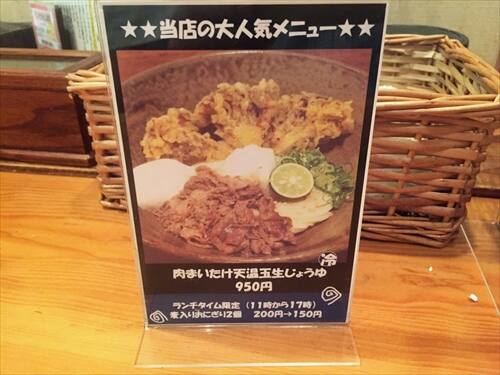 まいたけ天温玉生じょうゆと肉まいたけ天温玉生じょうゆのどちらにしようか迷ったのですが、座った席の前に「当店の大人気メニュー」と書いたものがあり、肉まいたけ天温玉生じょうゆが書かれていたのでこれを注文しました。