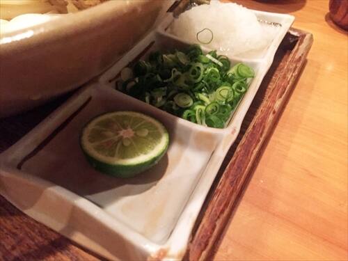 薬味は大根おろしと葱、すだちがありますので、これをかけてさっぱりとした味も楽しめます。