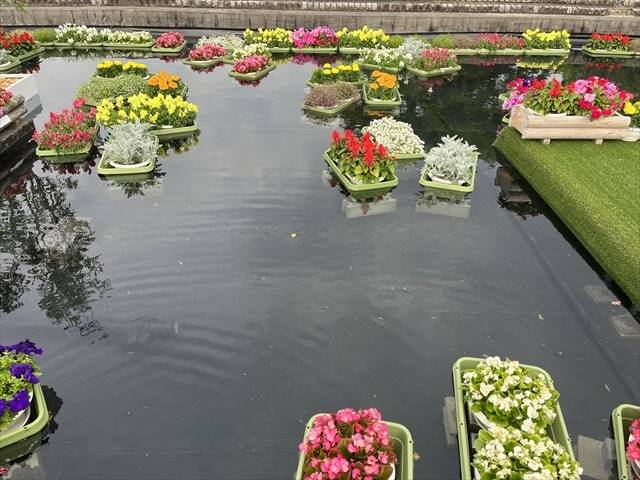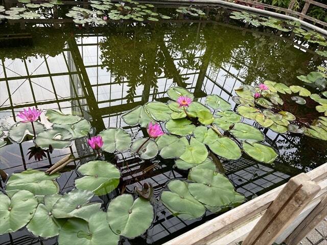 観賞温室の中には池があり、ハスが咲いていましたが、池の中にはメダカが飼われていました。