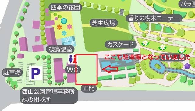 西山公園の駐車場は2か所あり、施設案内図では西山公園管理事務所の裏だけとなっていますが、正門から入ったすぐの場所も駐車場となっていて、こちらに私たちは車を停めることができました。