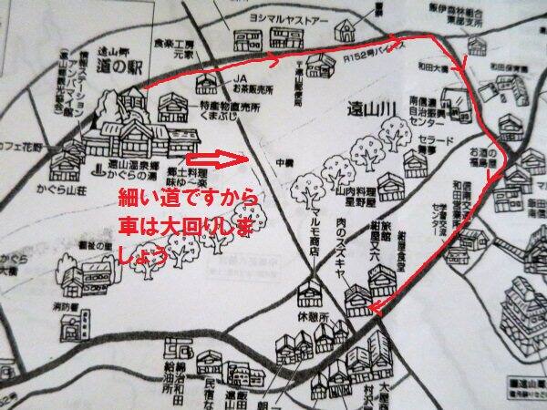 私の車のナビゲーションは違う道を勧めたのですが、事前にプリントアウトしておきました遠山郷のロードマップの道の方がよくわかりました。