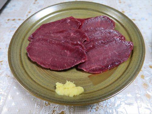 冷凍された鹿刺し用の肉は、冷凍庫から食べる時間の4時間前に冷蔵庫に移して解凍を行いました。
