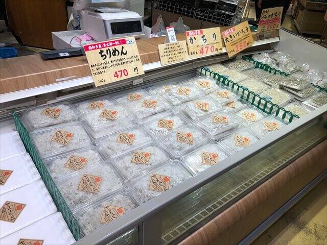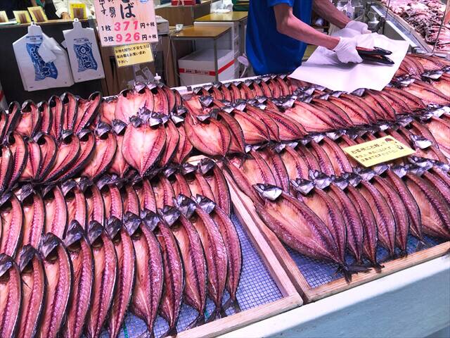 売店の入り口から入りますとまず正面に干物のコーナーがあり、人気と聞いていたとろさばが並べられています。