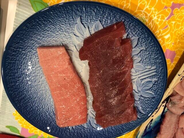 天然の黒鯛も魅力的でしたが、同じ白身ではない生マグロの中トロとキハダまぐろを買いました。