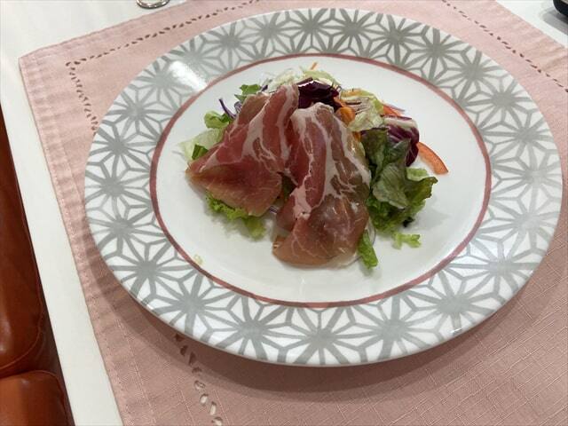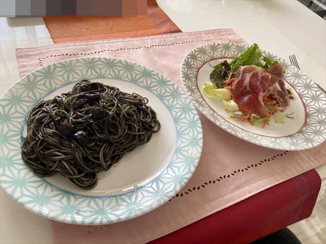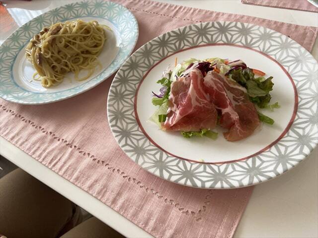 スーパーで買った野菜サラダに生ハムをのせたサラダと落合務シェフ監修の予約でいっぱいの店のソースでの簡単パスタで使ってみました。