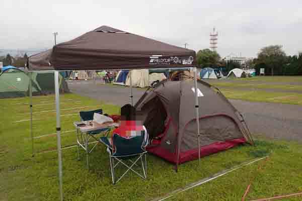 我が家はフライシートがありませんので、車で近くのホームセンターに行き、ブルーシートを購入してきてテントの上にかぶせて使用しました。