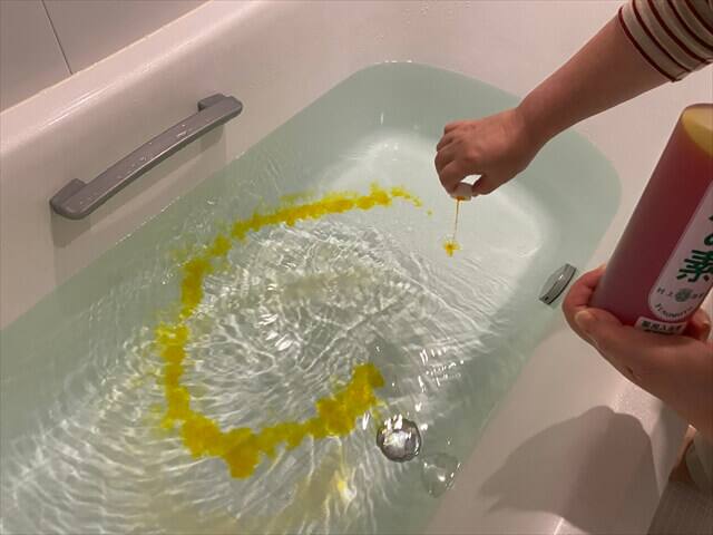 湯の素のボトルのキャップ1杯分を沸いたお風呂に入れてみますと、最初は液体の黄色が広がっていくのですが、かき混ぜていきますと硫黄のほのかな香りと共にお湯は白い濁り湯となっていくのです。
