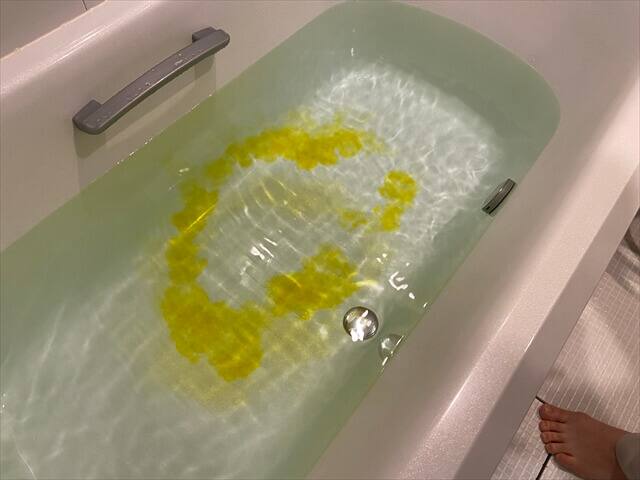 翌日の朝にお湯を抜いた浴槽を見ますとお湯の水位の場所が黄色くなっていたのです。