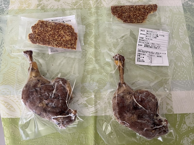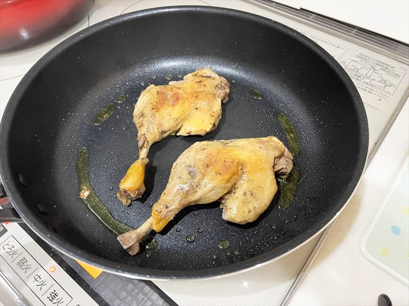 鴨のコンフィは電子レンジで加熱後にフライパンでと書かれていましたが、我が家の場合はスープを湯煎したお湯に付けて温めておきました。