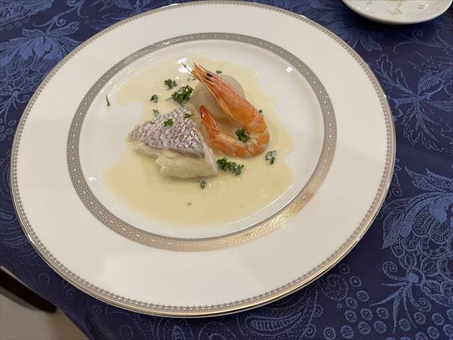 次は柔らかく低温調理でヴァプールした市場直送の真鯛と、北海道産のホタテと有頭海老のロティ、ソースヴァンブランです。