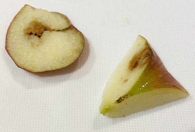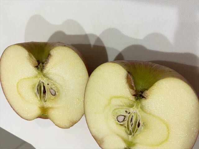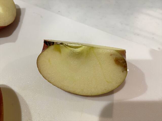 届いてリンゴの箱を開けましたら傷のあるリンゴが多かったので、傷のあるものから選んで先に食べた時に切った状態のものです。