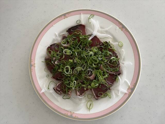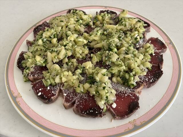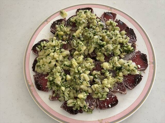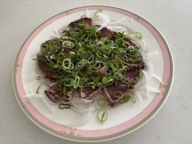 その時はスーパーで特価品だったカツオのたたきを購入して作りました。