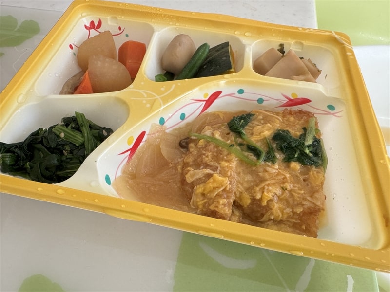 トンカツの卵とじがメインで、副菜でほうれん草のおひたし、若竹煮、野菜の炊き合わせが入っています。