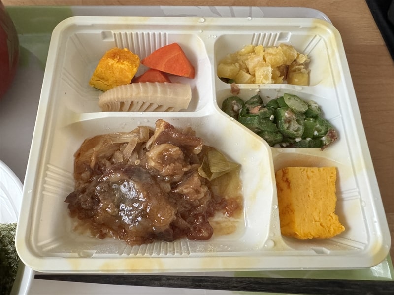 メインは牛肉のしぐれ煮風となっていて、副菜はさつまいもの甘露煮、厚焼き玉子、オクラのおかか和え、野菜の炊合せが副菜となっています。