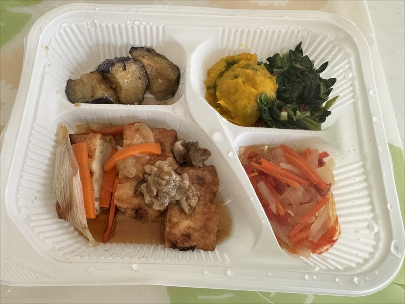 メインは豆腐の包み揚げのあんかけセットで、副菜はかぼちゃの和え物、ほうれん草のおひたし、野菜と春雨の甘酢和え、なすのおろし和えとなっています。