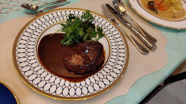 そしてメインディッシュの黒毛和牛と黒豚のフレンチ・ハンバーグですが、コンビニの高級ハンバーグとは違い肉の食感を楽しめるものでした。