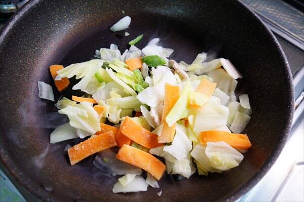 加熱は4分弱ですから先に肉入りカット野菜をフライパンで炒めます。