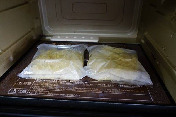 麺の解凍をレンジで同時にしたのですが、2個を一緒に入れたためか麺が一部解凍されていませんでした。