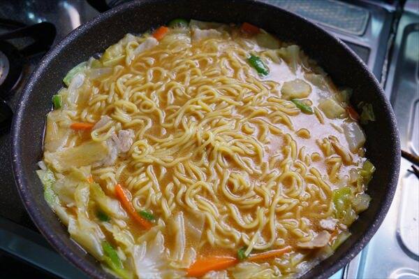 一部麺が解凍されていなかったことから今回はフライパンの中に麺を入れました。