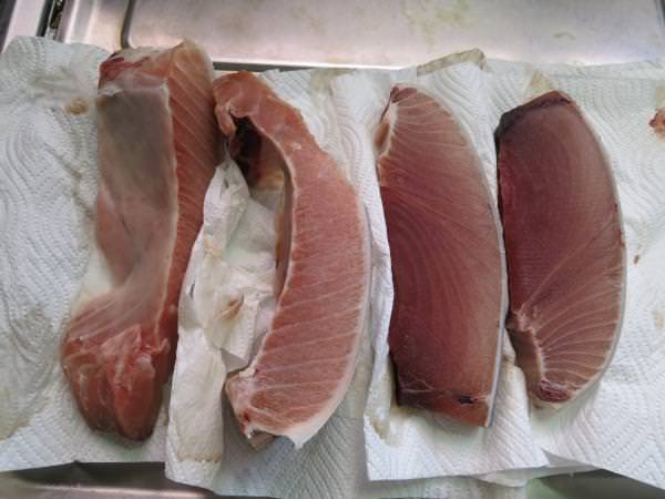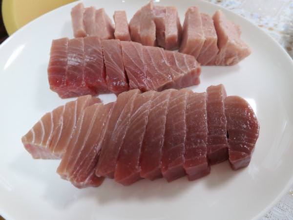 右側のブロックは比較的簡単に刺身にできるのですが、左側のブロックはカットに非常に手間がかかり素人の私ではうまく刺身にすることが出来ませんでした。