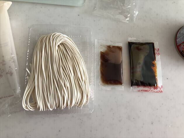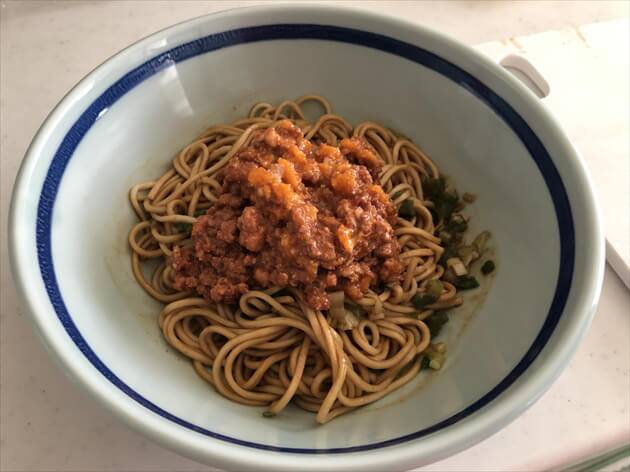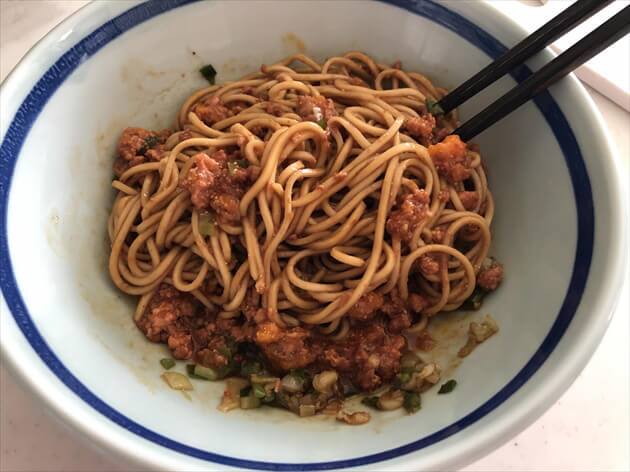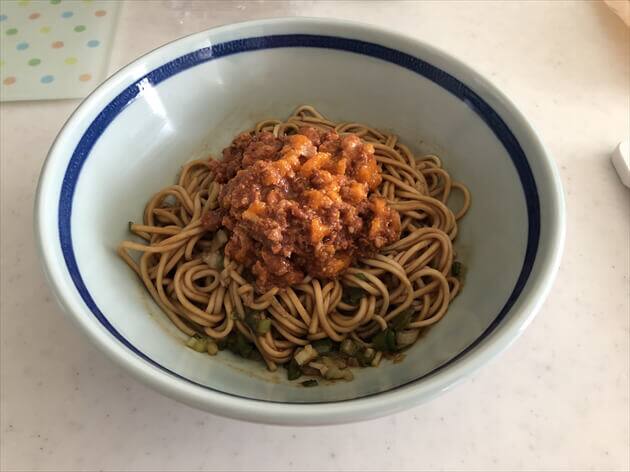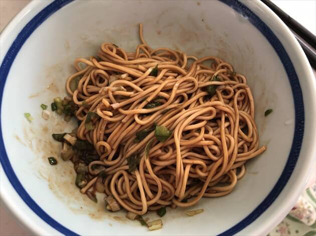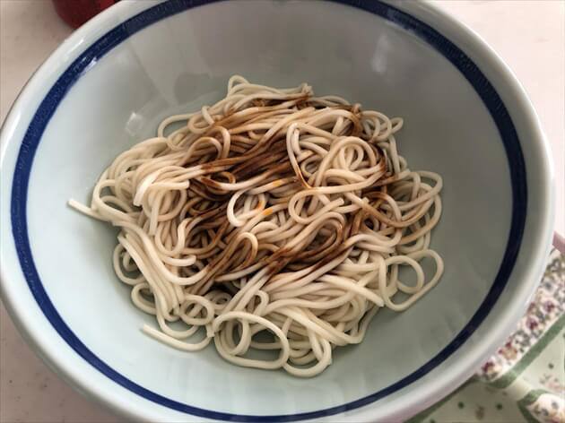 茹で上がった麺はザルでお湯切りすればあとは袋に入っていた黒酢とスパイスをかけて混ぜるだけです。