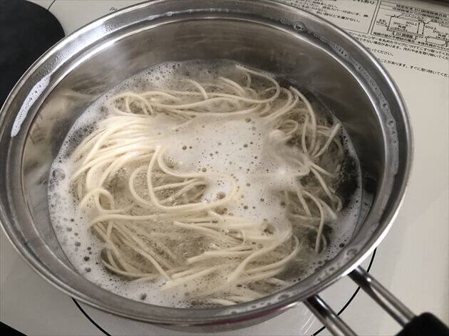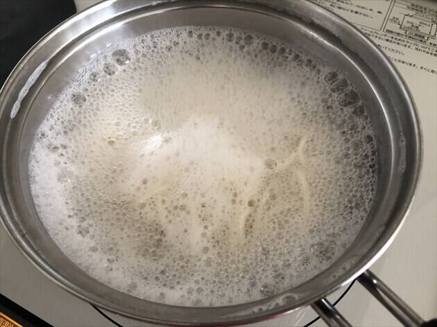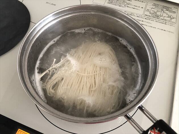 麺を茹でている時には多量の泡が発生しましたので、鍋から噴きこぼれない様に火力の調整が必要です。