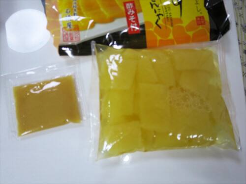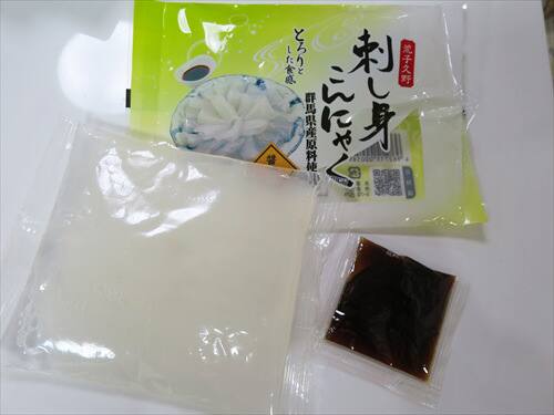 今まで購入した刺身こんにゃくは酢味噌で食べるものばかりでしたが、今回の刺身こんにゃくには醤油が入っていました。