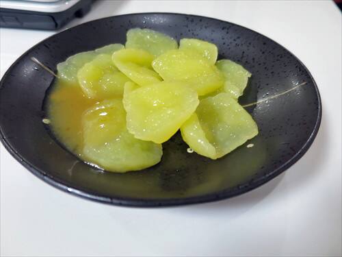 健康的なおつまみだとは思いますが、刺身こんにゃくをイカのように細くきるのが面倒です。