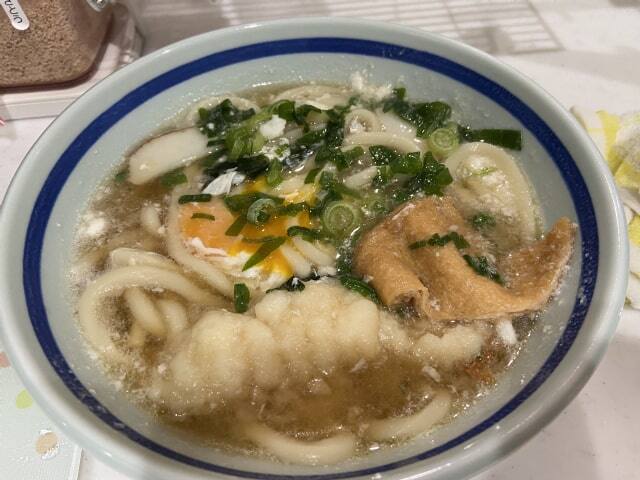 うどんを入れて煮立つ前に入れてみたのですが、白身が少し泡立ちは汁が白濁してしまったのですが、美味しさはやはり卵を入れた方がアップしました。